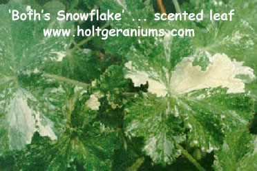 Пеларгония “Both’s Snowflake” (“Ice Crystal Rose”) имеет глубоко рассеченные серо-зеленые листья цвета с брызгами сливочно-белого цвета, мелкие лавандово-розовые цветы и сильный аромат лимон-роза. Одно из крупных растений для посадки в контейнер.