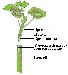 Для прививки берут черенок пеларгонии 7-8 см с двумя или тремя почками в пазухах срезанных листьев. Нижнюю часть такого черенка обрезают с двух сторон в виде лопаточки или клина с таким расчётом, чтобы нижняя почка оказалась между двумя срезами.