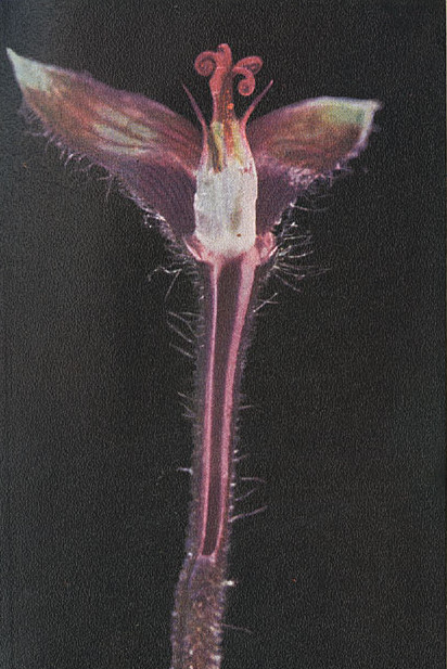 На фотографии показаны тычинки герани, которые значительно вытянулись и сгруппировались вокруг пестика к тому времени, когда их пыльца готова к переносу насекомыми. Каждая из этих пяти тычинок имеет пыльник, или пыльцевой мешок, который прорывается и выворачивается наизнанку, когда пыльца созрела.