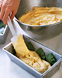 1. Предварительно подогрейте духовку с расположенной в центре решеткой до 325 градусов по Фаренгейту (160 градусов по Цельсию). Сбрызните форму для выпечки размером 9х4 1/2х2 3/4 дюйма растительным маслом из разбрызгивателя; застелите пергаментом. Разложите листья герани по дну и по сторонам формы.