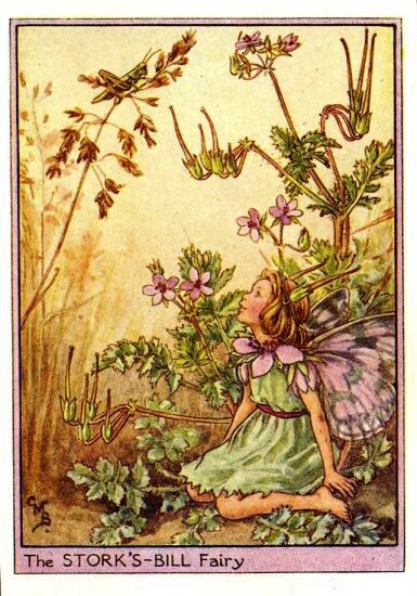 Фея аистника цикутового (Stork’sbill, Erodium cicutarium). Иллюстрация Сесиль Мэри Баркер из книги “Феи придорожных цветов” (“Flower Fairies of the Wayside”), 1948 г.
