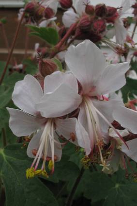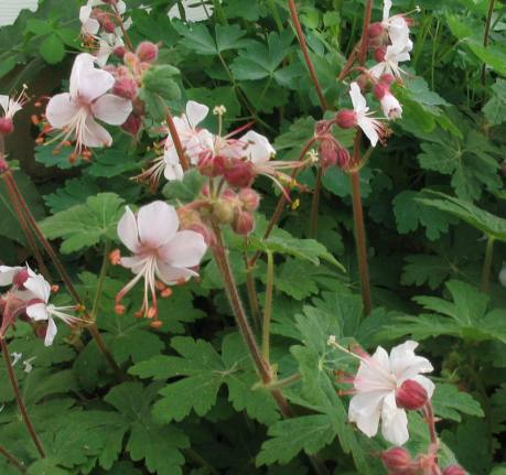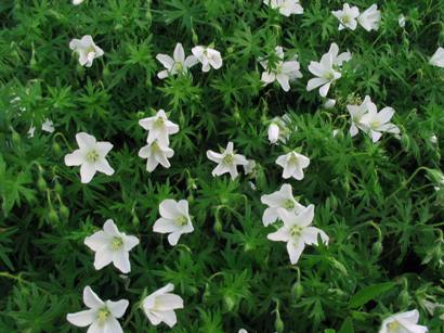 Длительное цветение, стелющийся журавельник. За счет сплетающихся стеблей образует кусты, которым отцветающие цветы придают неряшливый вид. Цветы (мы выращиваем белую форму с темными розовыми прожилками) мелкие, но красивой формы; листья аккуратной, круглой формы.