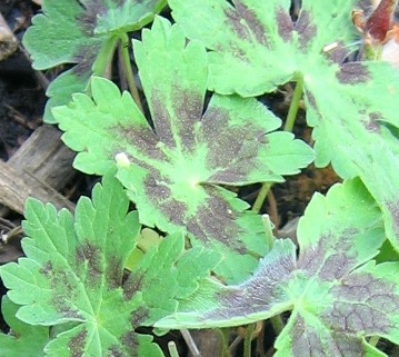Заметные маркировки на листве молодых растений герани красно-бурой сорта 'Самобор' ('Samobor')