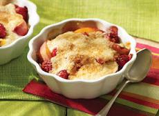 Из персиков будет вытекать сок, поэтому поместите их на смазанное маслом жаростойкое блюдо размером 11x7x2 дюймов (28х18х5 см) или 13x9x2 дюймов (33х23х5 см) или на индивидуальные маленькие блюда для гратина. Обсыпьте жареным миндалем. Поверх фруктов и орехов залейте теплым соусом; равномерно размазав его к краям. Поверх соуса обсыпьте крошкой.