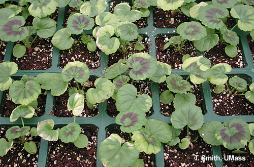 Хлорозные пятна на листьях сеянцев гераней вызваны применением регулятора роста растений с действующим веществом хлормекват (chlormequat), торговая марка Сайкосел (Cycocel).