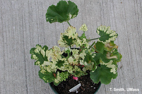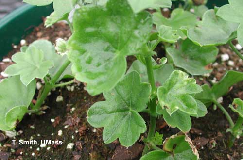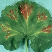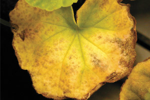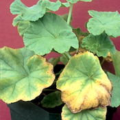 Хлорозные повреждения листьям герани может нанести гербицид, содержащий активный компонент хломазон (clomazone), примененный в оранжерее.