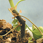 Почерневшее основание стебля (“черная ножка”) на растениях, таких как герань, часто вызывается патогенными грибками рода Pythium. Грибковая болезнь развивается на переувлажненных и слишком плотных почвах.