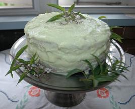 Смажьте глазурью между слоями, а также верх и боковую сторону пирога. Украсьте листьями герани с запахом лайма или лимонной вербены, либо их цветами, если возможно.