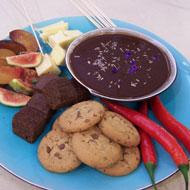 3. Вылейте шоколад в небольшую чашу и подавайте вместе с продуктами по Вашему выбору, которые Вы будете окунать в шоколад, такими как кубики сыра чеддер, кубики шоколадного кекса, маленькое печенье, неострый перец чили или кусочки фруктов.